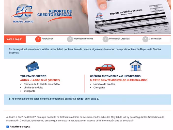 Lee la información que se te presenta. La página te pedirá una autorización para consultar tu historial crediticio, debes seleccionar la casilla Autorizo y acepto.