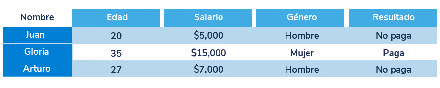 Cada renglón sería un ejemplo y cada columna una variable de la que se puede aprender su relación a Paga / No paga.