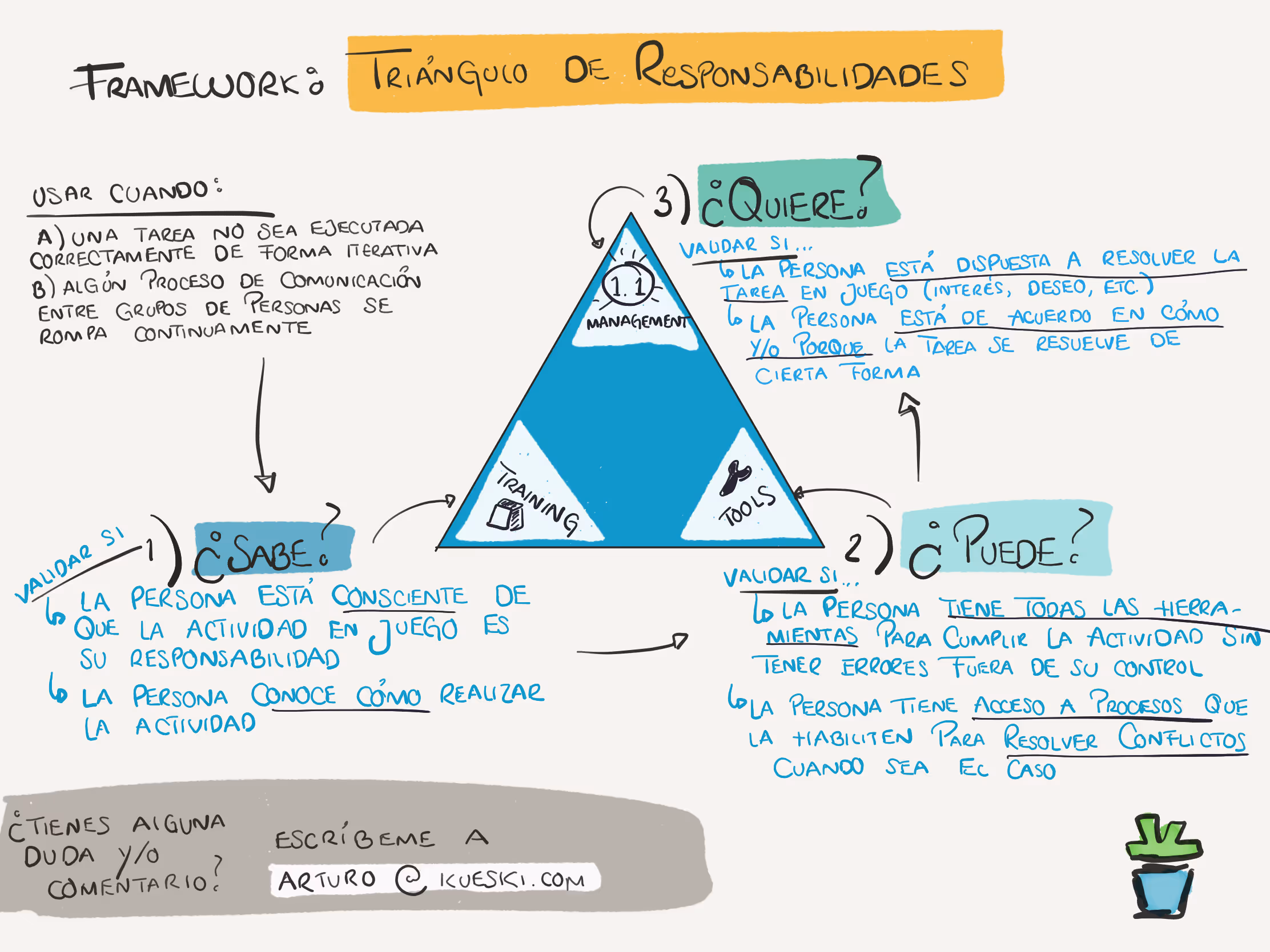 Un ejemplo de un modelo de pensamiento que utilizamos comúnmente en Kueski es el triángulo de responsabilidades. Este modelo ayuda a figuras de liderazgo a resolver conflictos con individuos de forma particular. Básicamente explica lo siguiente.